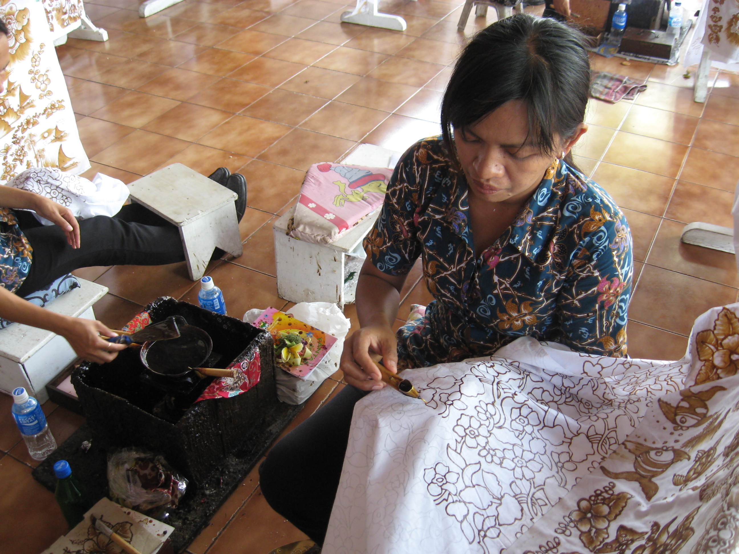 On Feb.24 we said goodbye to Putri and our apartment in Sanur. We walked out to the street and met a taxi driver who had been hanging out in front of our hotel since the day we arrived. We hired him to take us to Ubud. He volunteered that he would make a few stops along the way. Our first stop was at this 'Batik' clothing shop. We watched artists first draw the design, then trace the lines with hot beeswax. Then the cloth is dyed after which the wax is dissolved, leaving the deep rich colors and the fine crinkle lines that give batik its character.