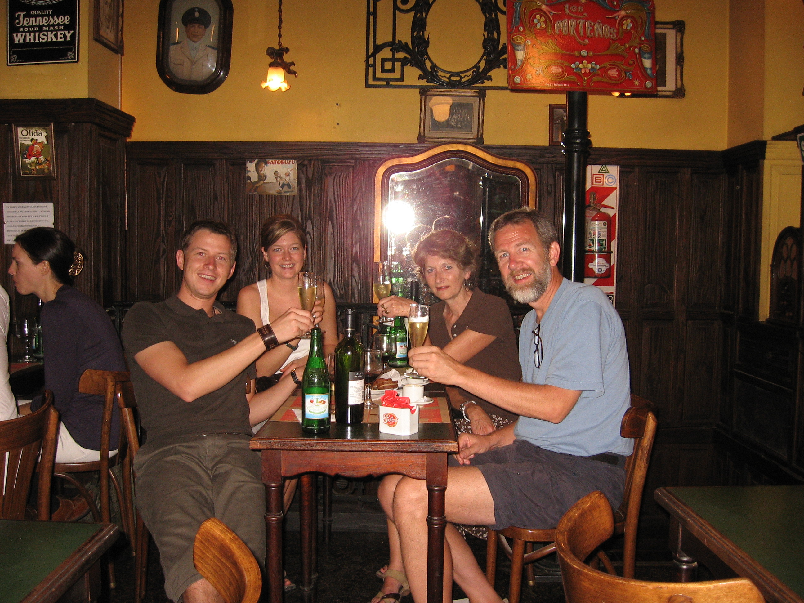 We thought that at least SOME restaurants would be open Christmas Eve, but as we headed into the Recoleta area it seemed that everything was closed. Even the cinema and Macdonalds. A few steak places were open but they only offered expensive set menus with entertainment. We all weren’t very hungry; we’d eaten too many snacks – crackers and cheese and chips with our pisco sours. We finally went to a corner restaurant on Las Heras. Only foreigners here – a French couple, some Germans, some English-speaking people. Food was hearty, lots of it, not great, but it turned into a fun evening. The two bottles of wine and the dessert and champagne helped us to get over the stress and frustration of things not working out according to plan.