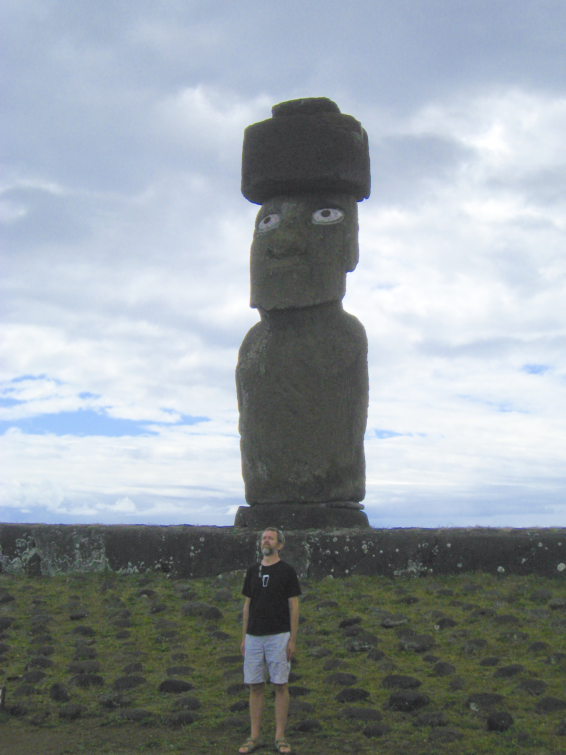 Ahu Ko Te Riko. It was evening and so these moai had the sun setting behind them -- I had to brighten the photo to compensate for the backlighting. Note the arrangement of stones on the ahu (platform).